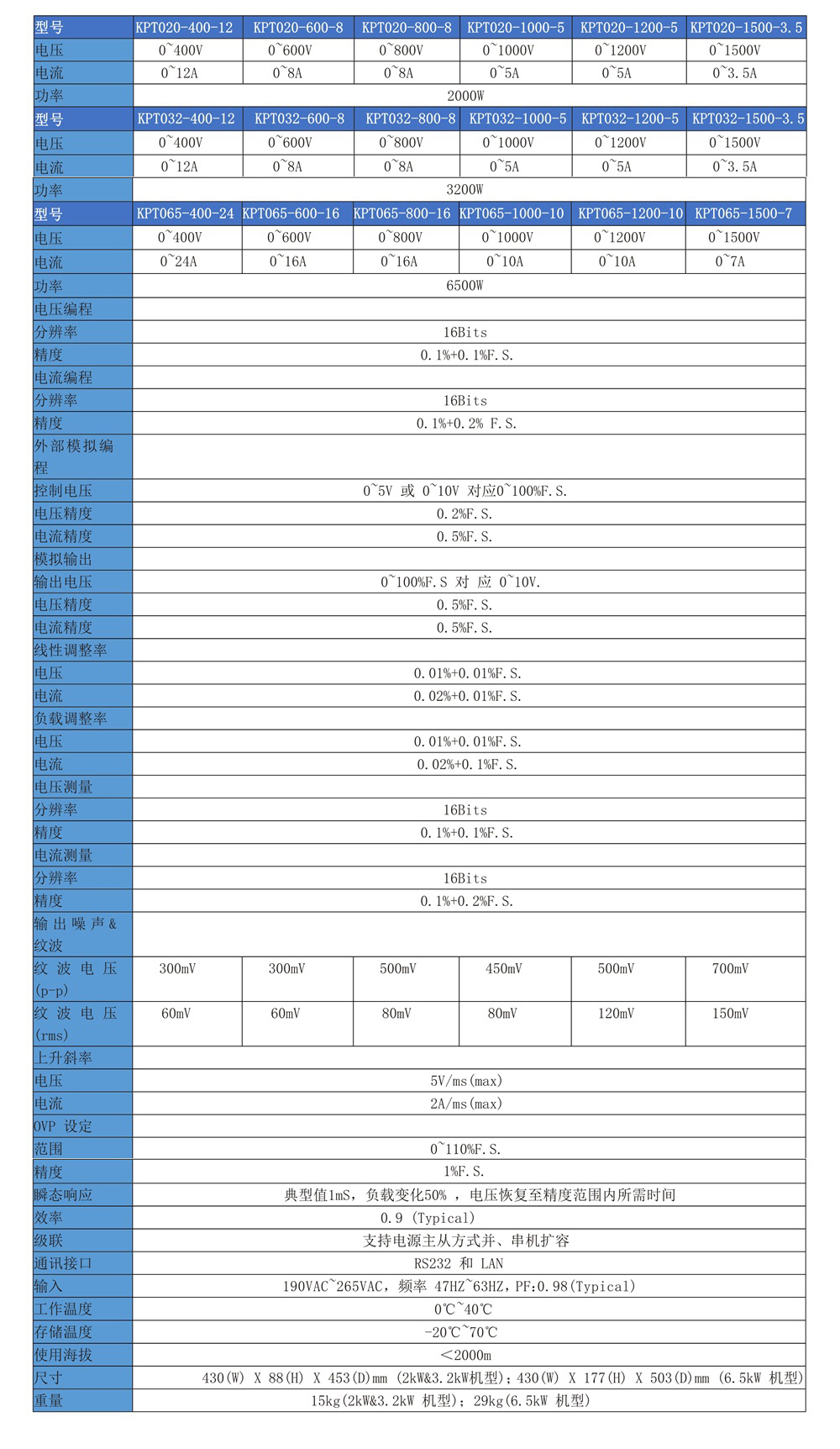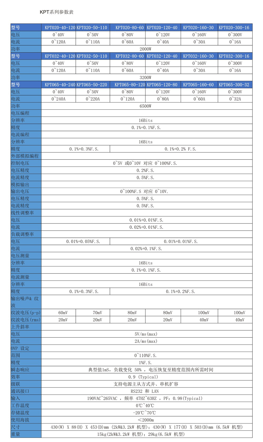 KPT-H系列寬范圍大功率可編程直流電源具有高功率密度、高功率因數、率、寬范圍輸出的特征。其寬電流范圍輸出及自動恒功率的加持,可大大增加應用覆蓋范圍。配有LAN/RS485/CAN/GPIB/USB(串口)接口,既支持SCPI也支持標準ModBus-RTU協議,配合內置隔離數/??刂平涌冢瑤淼膽枚鄻有约氨憷浴_x用支持多種語言的操作界面,給使用者帶來直觀的操作體驗。